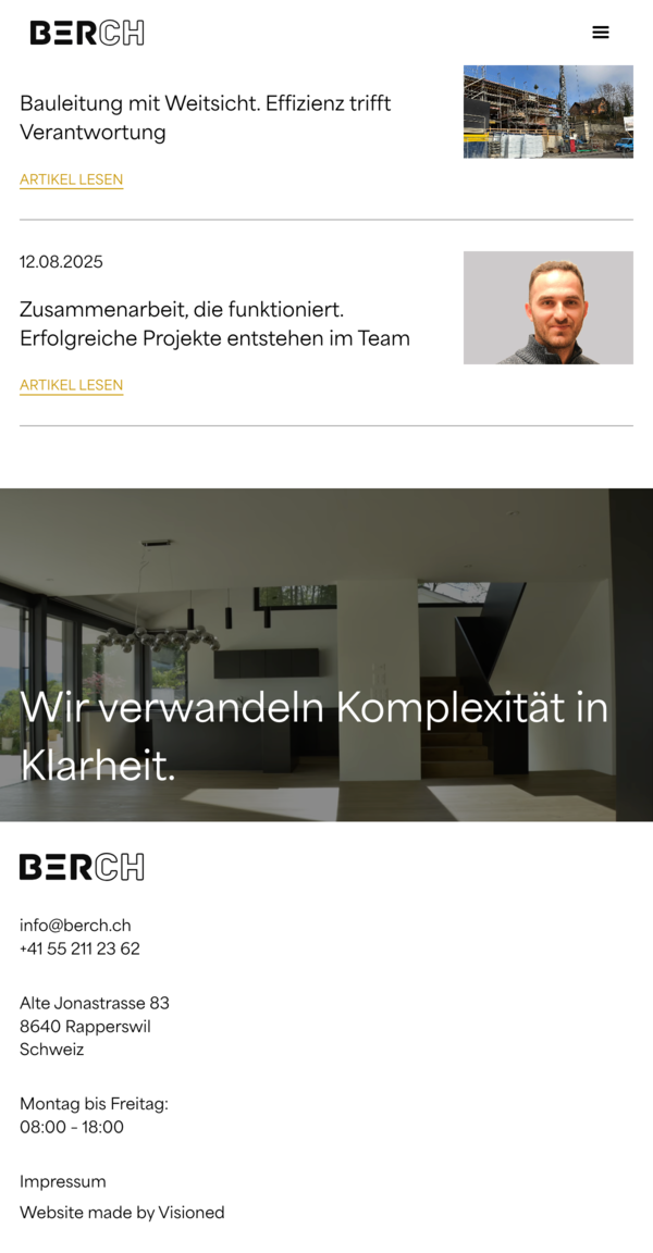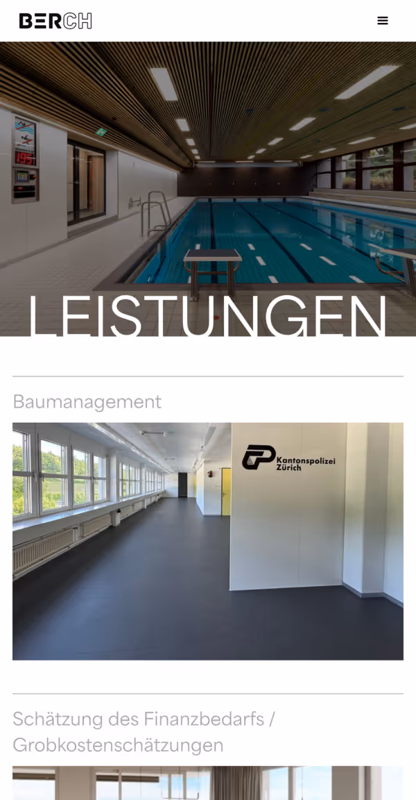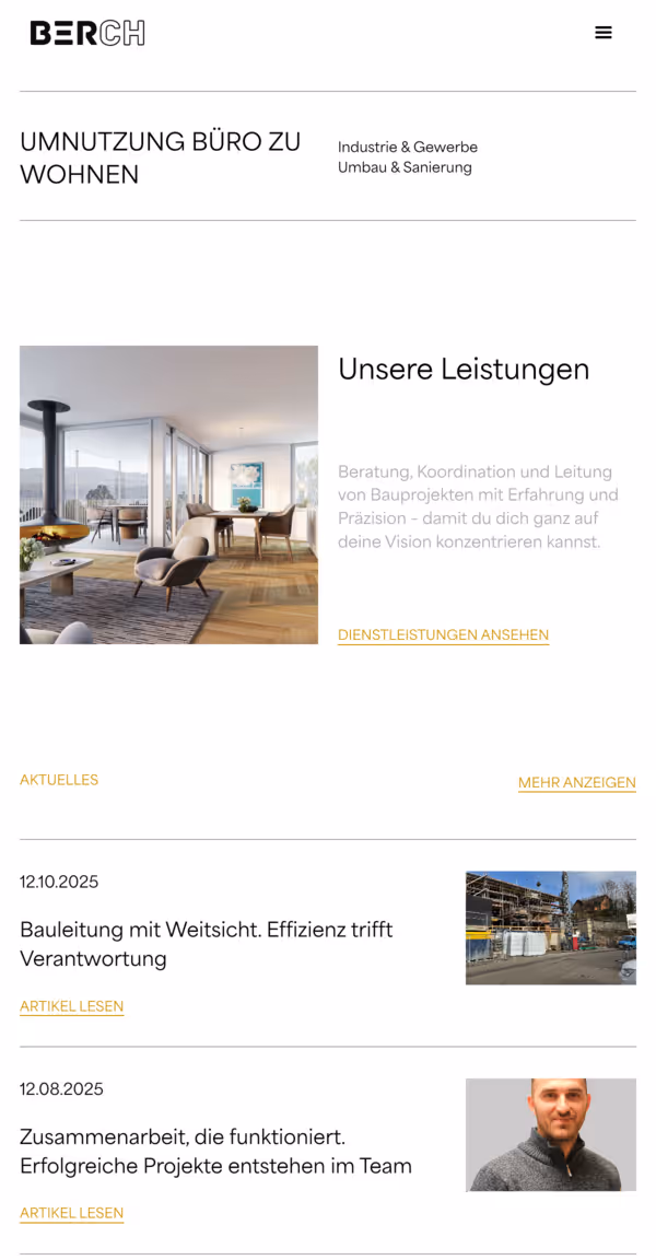 Ziel war kein lauter Auftritt, sondern eine Plattform, die Vertrauen über Klarheit aufbaut. Die Leistungen reichen von Kostenplanung über Ausschreibungen bis hin zur Qualitätssicherung und mängelfreien Übergabe. Diese methodische Arbeitsweise übersetzten wir in ein stringentes digitales Erlebnis, das Professionalität vermittelt und Berch als verlässlichen Partner für alle Phasen eines Bauprojekts positioniert.