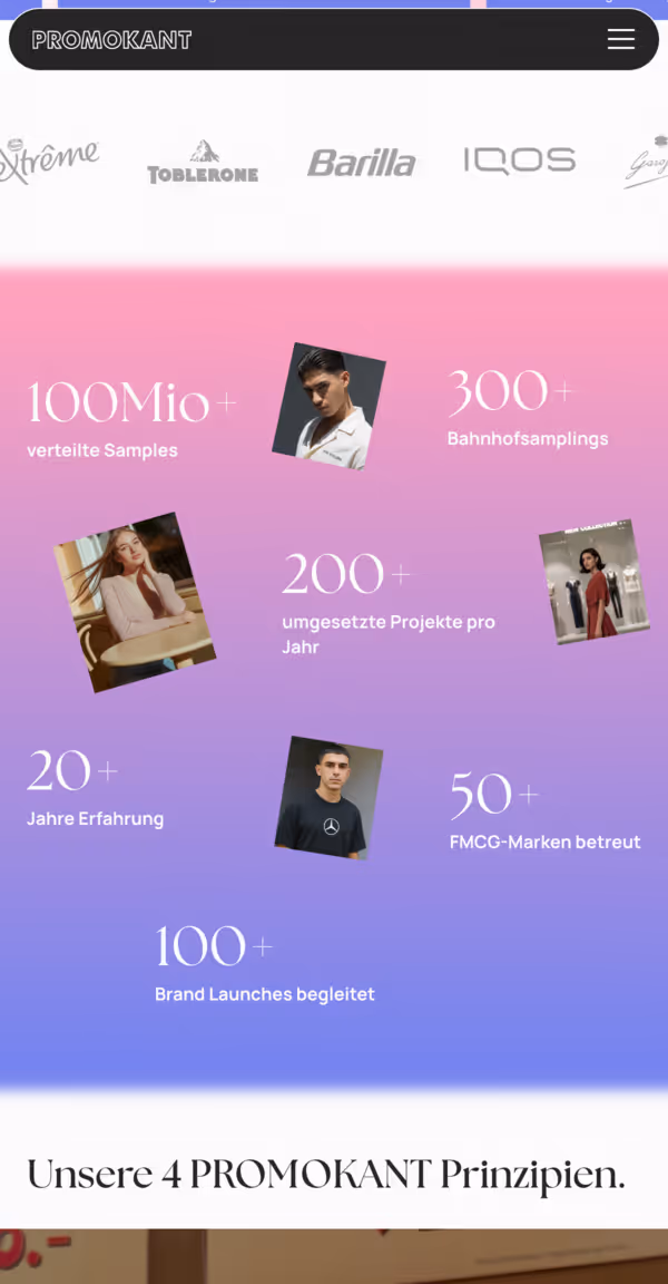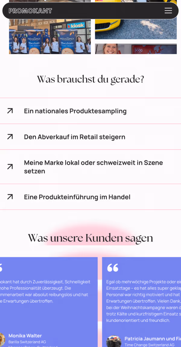 Die Website wurde darauf ausgerichtet, Promokants Kernprinzipien wie Markenverständnis, Qualität, echte Begegnungen und messbare Resultate digital zu repräsentieren. Durch eine prägnante Botschaft und eine strukturierte Darstellung der Leistungen entstand ein moderner Auftritt, der Vertrauen schafft und die Positionierung als professioneller Partner für Markenaktivierung stärkt.